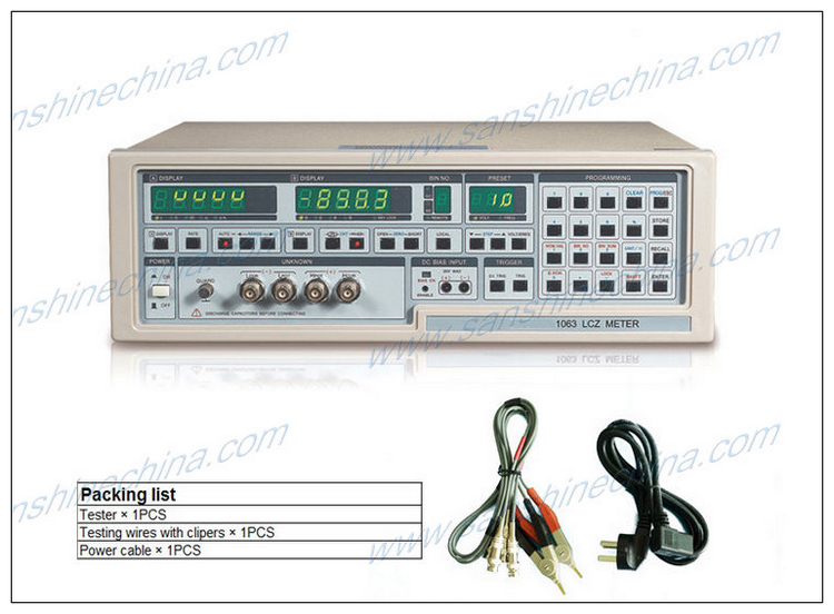 The 200KHZ automatic judgement accuracy digital LCZ LCR meter (SS1063) is a test system for testing the electronic and electric passive components which designed for the use in electronic inspection or production process quality control. The 200KHZ automatic judgement accuracy digital LCZ LCR meter (SS1063) can substitute Chroma LCR meter 1063 and Zentech LCR meter 1063 fully and easily. The 200KHZ automatic judgement accuracy digital LCZ LCR meter (SS1063) meets any demanding requirement on production speed and precision, discrimination of qualified products from unqualified ones, as well as internal setup, storing and calling function for up to 10 instrument groups. This accuracy digital LCZ LCR meter (SS1063) tester can judge the testing result automatically according to user seted up parameter limit. So this 200KHZ automatic judgement accuracy digital LCZ LCR meter (SS1063) is actually optimum test instruments for component incoming and production inspection. Like as: transformer, inductor, resistor, capacitor, relay, motor, generator, coils, eletric valve, contactor,cable,wire,etc.