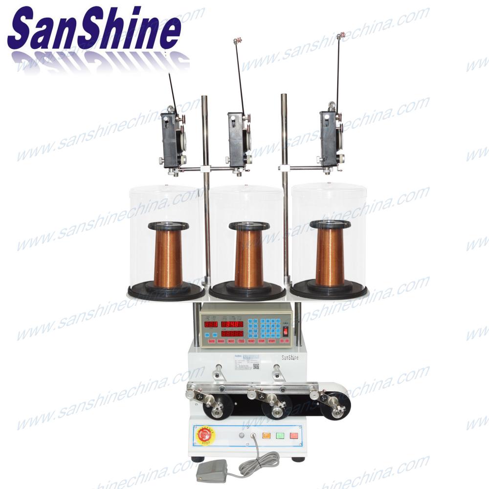 The Front Three Spindles Programable Automatic Coil Winding Machine (SS863) is a digital programmable high speed coil winding machine. This winding machine adopts the front type winding spindles of the winding machine base. Adopts the wire tensioner with the nozzle type wire spreading head so that make sure the fine wire be winded in precise and perfect under high speed. This coil winding machine is the highest efficiency equipment which make the three pieces winding spindles to wind coils in synchronously. This three spindles winding machine is named low frequency transformer winding machine and three spindles automatic coil winding machine also. This winder is best choice for winding transformer, inductor, relay, ignition, contactor, electric valve, etc. .